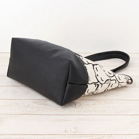 型崩れしにくく持ちやすいように底部分とハンドル部分は合皮素材で仕上げました。口元はオープンです。